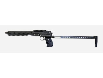 Jednoranová puška R&R Big Wolf v ráži 9mm Flobert, styl „Pavlíček“. Moderní materiály, titanový úderník, drážkovaná hlaveň a sklopná pažba s úložným prostorem.