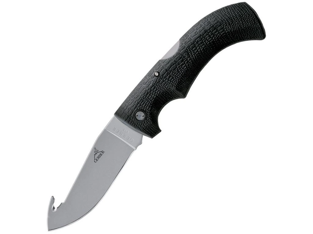 Zavírací kapesní nůž Gerber Gator Guthook s hákem na špičce čepele. Tvarovaná rukojeť design hadí kůže, pogumovaný povrch. Pouzdro pro nošení na opasku.