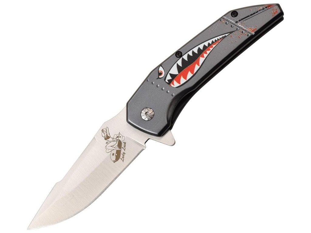 Asistované otevírání. Saténový povrch nerezové čepele. Šedá hliníková rukojeť s kresbou žraloka.