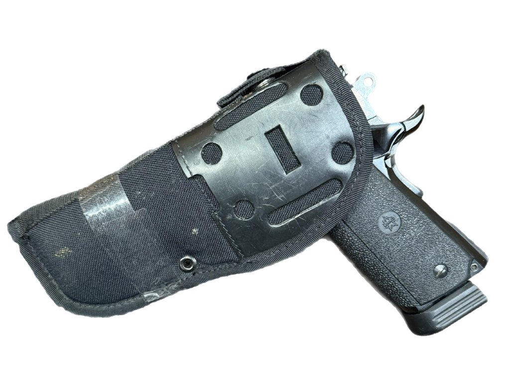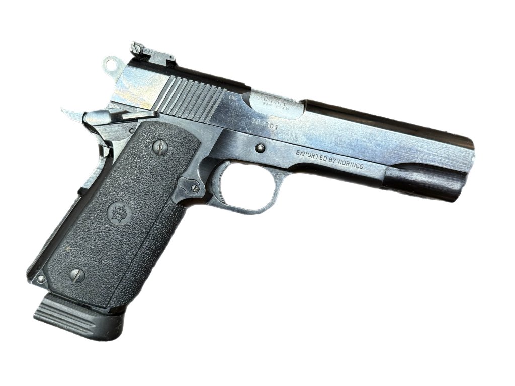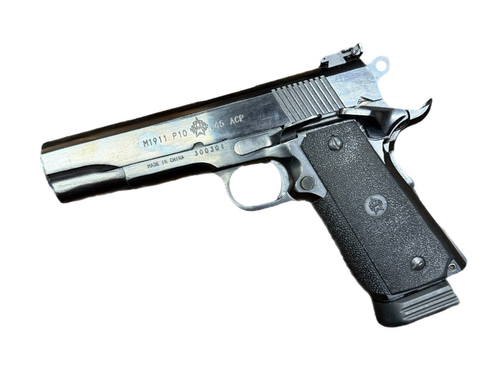 Čínský klon samonabíjecí pistole COLT 1911 A1 v ráži .45 ACP. Kapacita zásobníku 7 ran, Chromovaná hlaveň, povrchová úprava černý brynýr. Hledí v rybině, pryžové střenky.