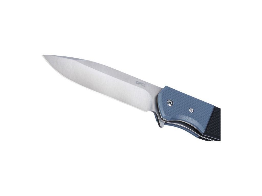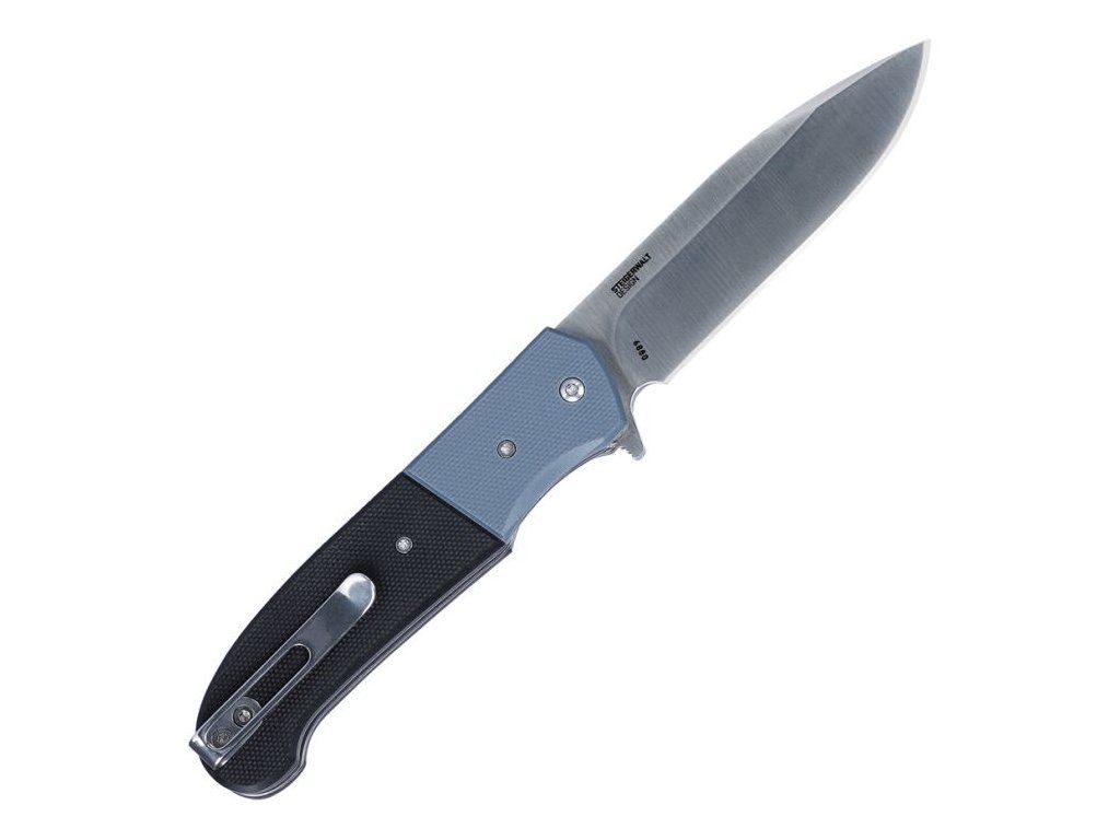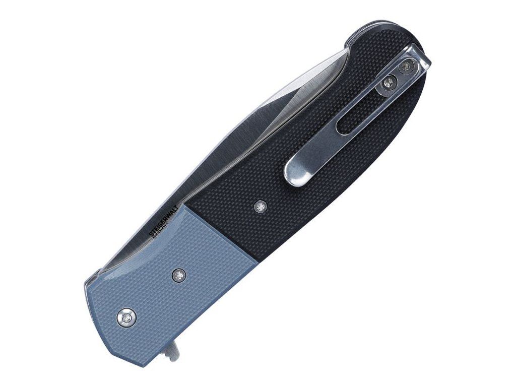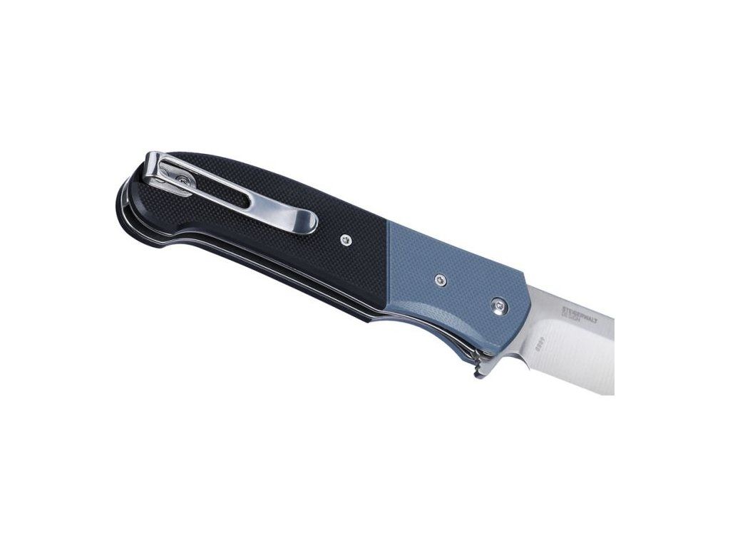 Rukojeť z odolného materiálu G10 v černo-modrém provedení poskytuje pevný, ergonomický a jistý úchop i při delším používání. Nůž je vybaven kapesním klipem, který umožňuje pohodlné nošení.