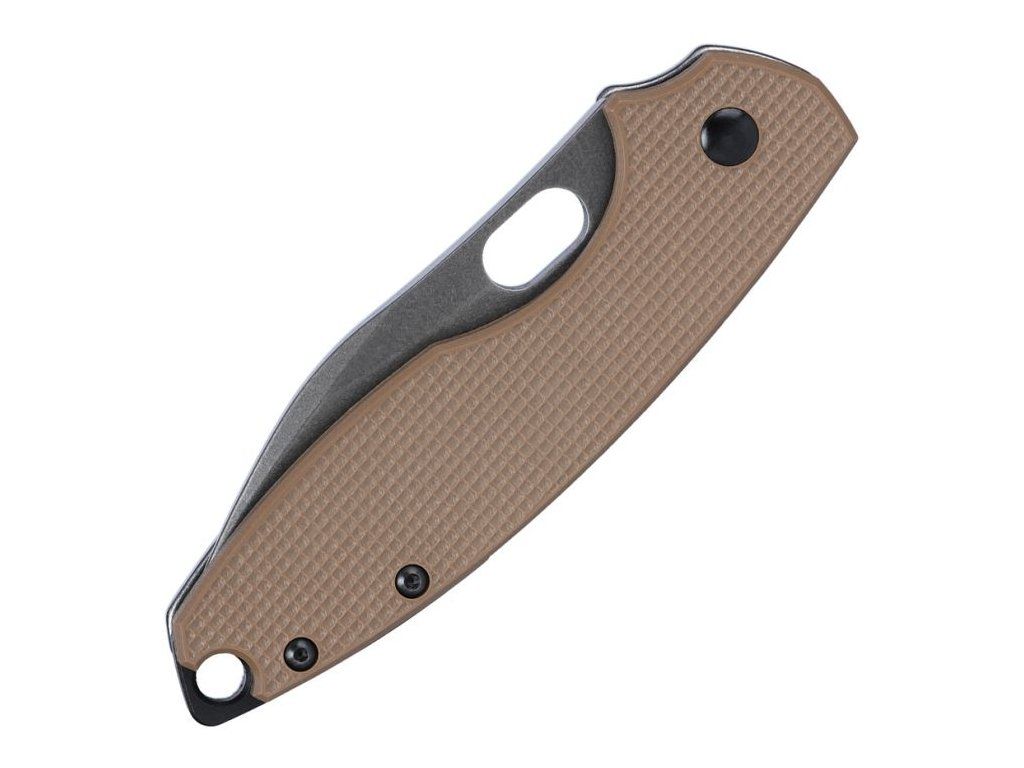 Rukojeť z texturovaného G10 v earth brown provedení v kombinaci s nerezovou zadní částí s black stonewash úpravou poskytuje pevný, ergonomický a odolný úchop. Nůž je vybaven kapesním klipem a otvorem pro pojistnou šňůru (lanyard hole).