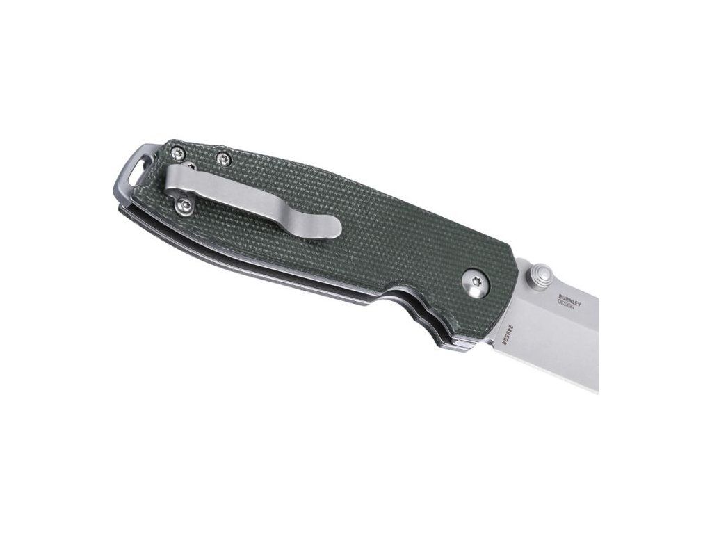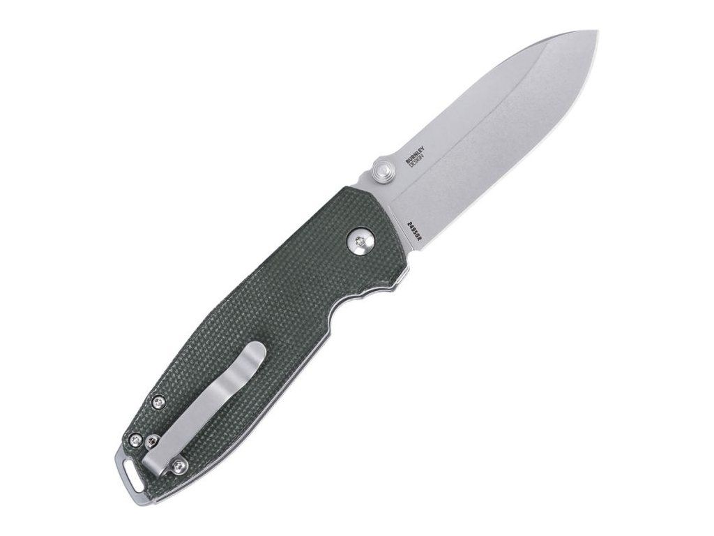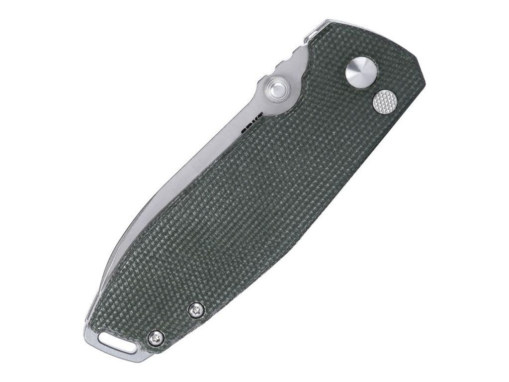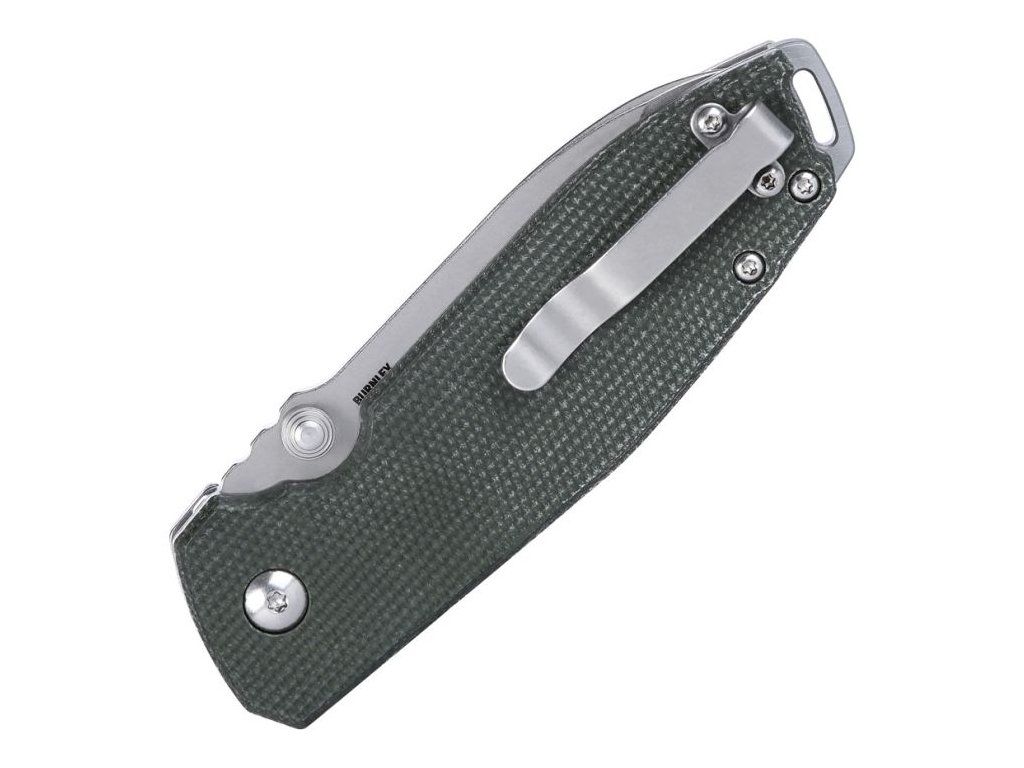 Rukojeť z micarty v zeleném provedení poskytuje pevný, ergonomický a příjemný úchop, který se dobře drží i v náročnějších podmínkách. Nůž je vybaven kapesním klipem a otvorem pro pojistnou šňůru (lanyard hole).