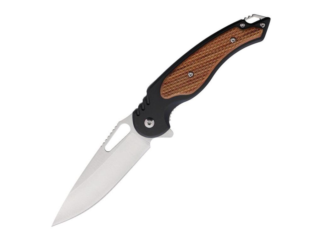 Rukojeť z černé nerezové oceli s tmavě hnědým dřevěným onlayem poskytuje pevnost, odolnost a příjemný úchop. Nůž je vybaven kapesním klipem a otvorem pro pojistnou šňůru (lanyard hole). Tento EDC zavírací nůž MTech je ideální volbou pro ty, kteří hledají funkční nůž s elegantním designem a přírodními prvky.