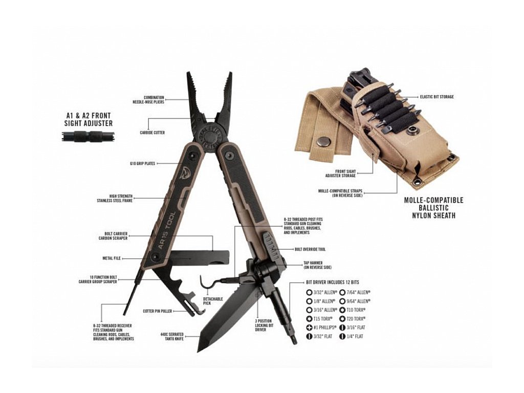 Multifunkční nástroj Real Avid AR15 obsahuje celkem16 různých nástrojů, které zajišťují pro vaši AR bezchybnou funkčnost. Uhlík je nepřítelem taktických pušek. Kleště AR15 odstraňují uhlík z 12 povrchů skupiny nosičů šroubů pomocí škrabky AR15 společnosti Real Avid. Čtvrtpalcový ovladač obsahuje 12 bitů, které zvládnou jakýkoli šroub na zbrani. Nástroj AR15 má také jistič karbidového skla, čepel Tanto z nerezového 440C 440C, nástroj pro vytlačení šroubu, karbidovou řezačku a kladivo na kohoutek. Multitool je dodávaný v praktickém pouzdře s možností upevnění na MOLLE systém.
