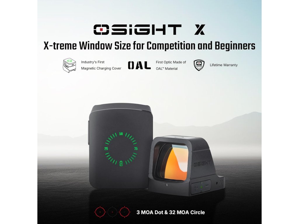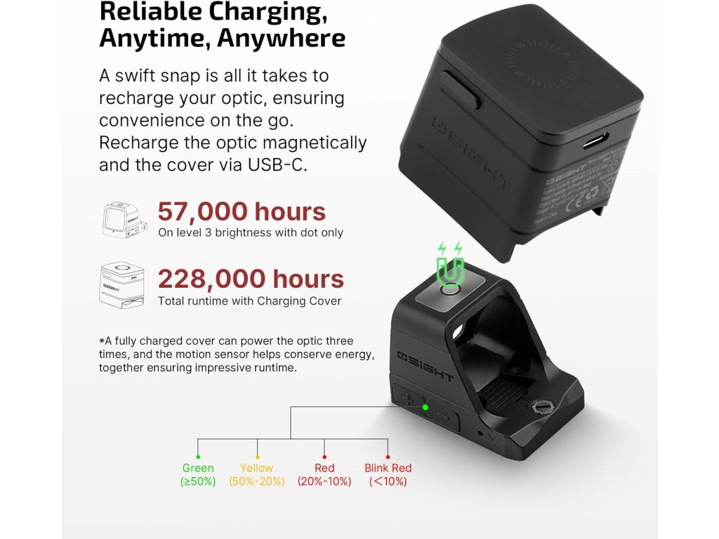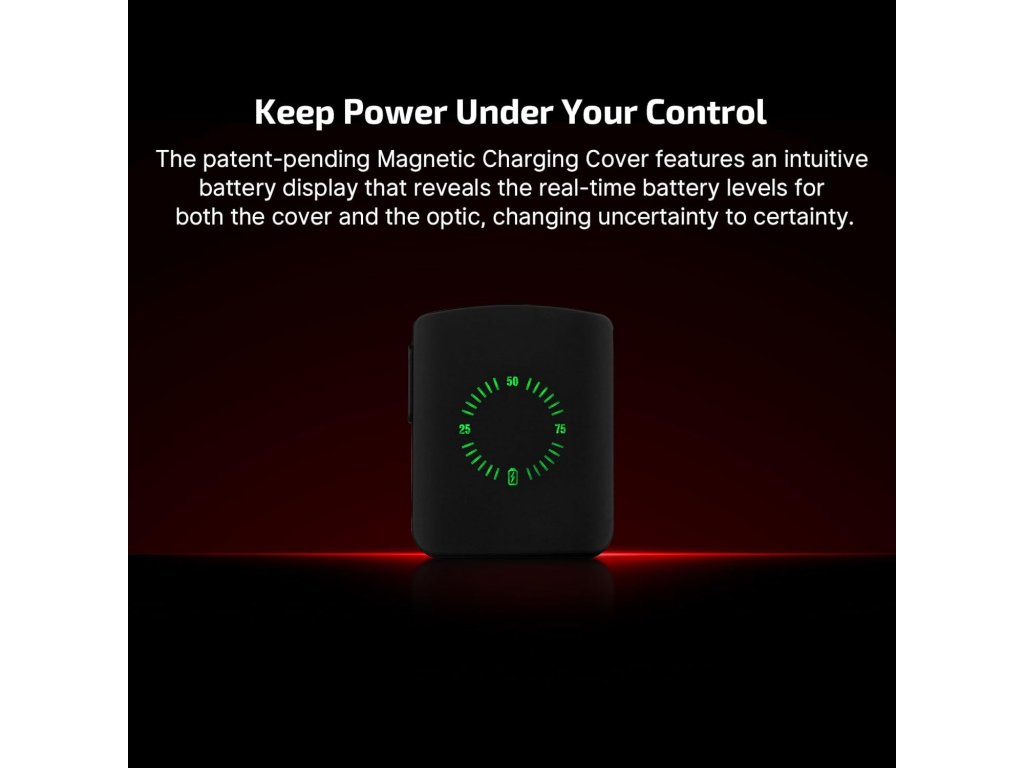 Přesnost, výkon a inovace – to vše v jediném těle Osight X, kolimátoru s průkopnickými funkcemi pro náročné uživatele. Zásluhou magnetického dobíjecího krytu s displejem baterie máte přehled o stavu energie jak samotné optiky, tak krytu, který zvládne Osight X plně nabít 3× (nabíjení trvá přibližně 2,5 hodiny).