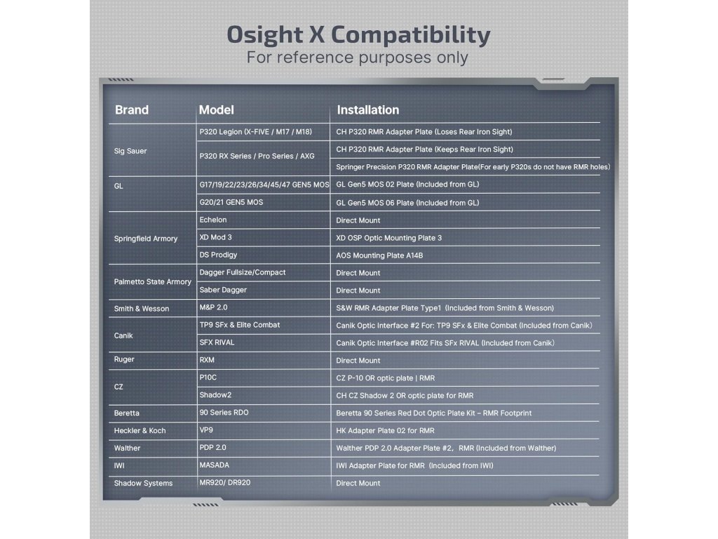 Odolné tělo z OAL™ materiálu – téměř stejně lehké jako dural 7075, s úpravou Level III anodizace pro extrémní odolnost vůči nárazům a korozi. Osight X obstál v testech s více než 100 000 výstřely, aniž by ztratil nástřel.