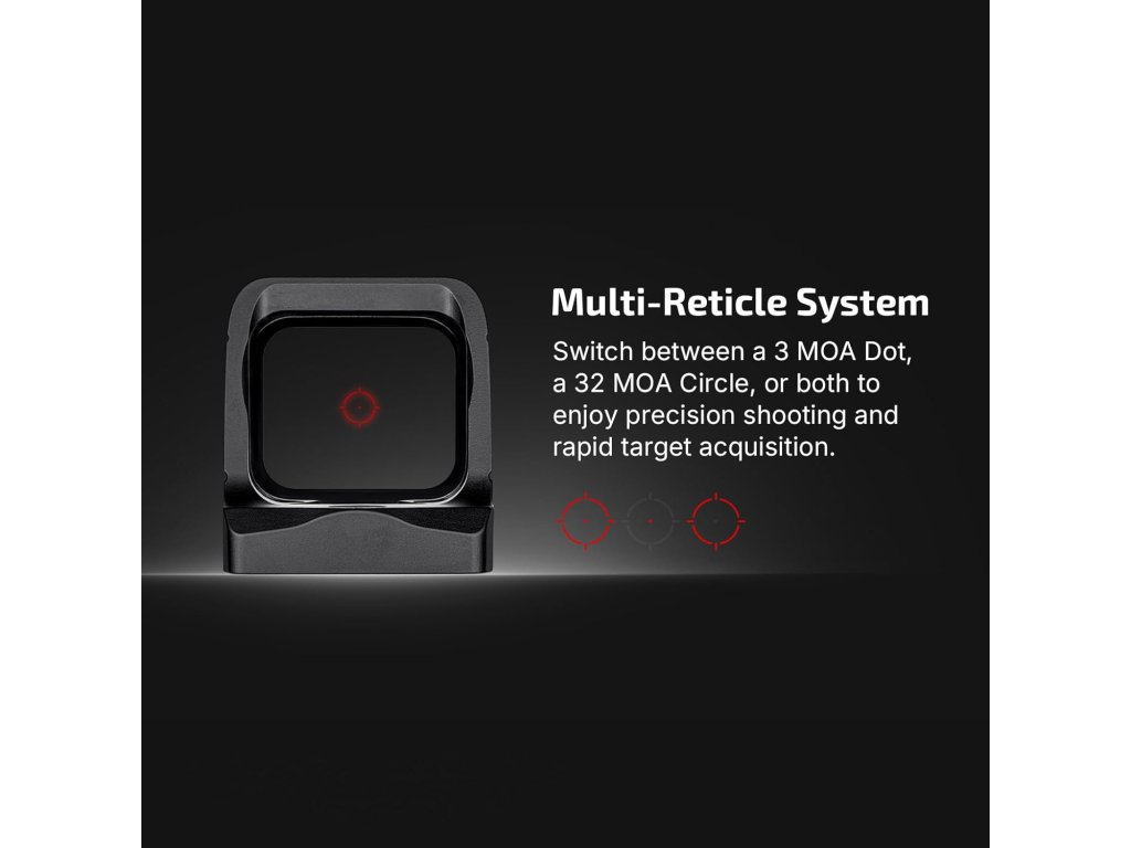 Vícenásobná záměrná osnova (3 MOA bod, 32 MOA kruh, nebo kombinace) umožňuje volit podle aktuální situace – ideální pro taktické nasazení, výcvik nebo outdoor.