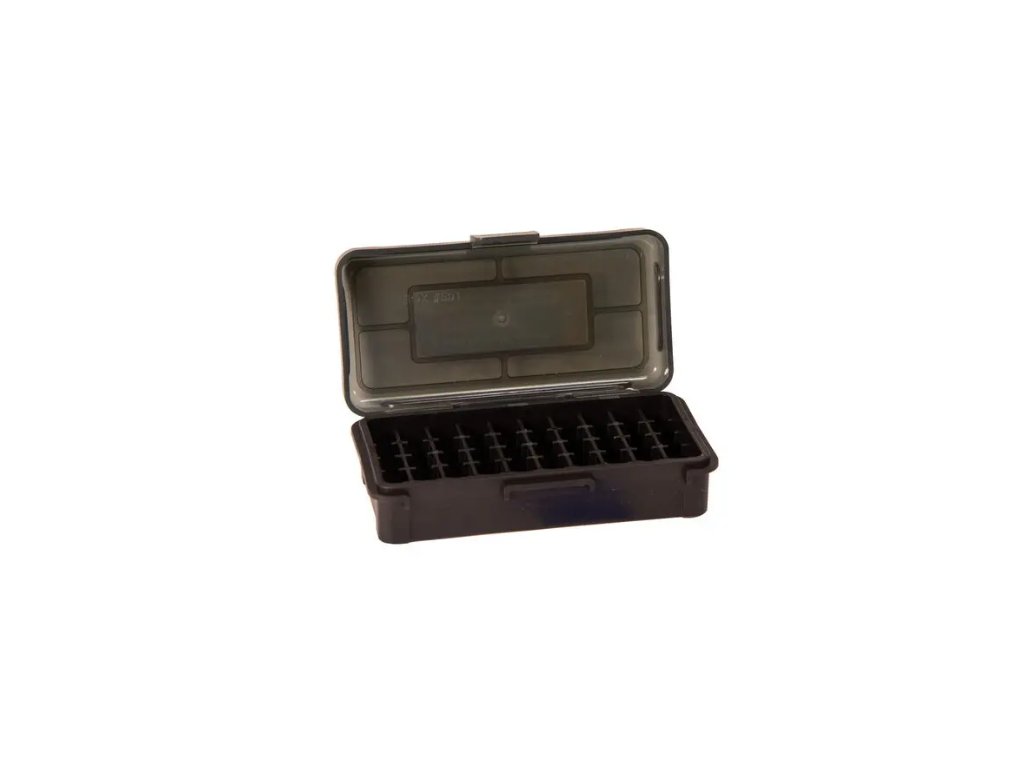 Krabička na náboje z odolného polymeru. Víko je ochyceno na pantech.