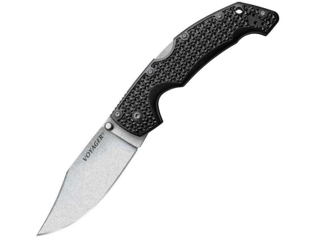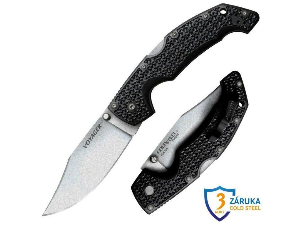 Řada zavíracích nožů Voyager® je jednou z nejstarších, nejžádanějších a nejprodávanějších řad v historii výroby firmy Cold Steel. Nože se vyrábí v několika tvarech čepele a každý tvar ve variantě hladkého a zubatého ostří. Čepel o síle 3,5mm nebo 4mm, je vyrobena z japonské oceli AUS 10A. Tato martenzitická, nerezová ocel má velmi dobré pevnostní vlastnosti a je vedena především jako materiál na řezné nástroje. Oproti AUS 8A lépe drží ostří a je odolnější proti otěru. Ocel byla následně tepelně zpracována pro dokonalou rovnováhu mezi držením ostří a snadným opětovným broušením. Čepel je ošetřena povrchovou úpravou zvanou Stone Wash Finish. Jde o úpravu čepele, v podstatě vyprání, se středně velkými kousky kamene. Tato úprava dodává výrobku domnělou patinu a ošetřenému materiálu matný povrch. Brání tak nechtěným odleskům leštěných čepelí a používá se při výrobě taktických nožů. Použitá ocel je schopna velmi dobře držet ostří, které je již z výroby ručně vybroušené do vysoké ostrosti. Voyager® nabízí také všechny další nejnovější vylepšení a bezpečnostní prvky. Otevírání nože jednou rukou, hliníkové vyvločkování rukojeti, nebo použití pojistného systému Tri-Ad Lock. Pojistka zabraňuje samočinnému nebo nechtěnému zavření nože i po přirozeném opotřebení v průběhu času. Rukojeť je vyrobena z materiálu Griv-Ex ™. Jde o materiál rukojeti s jedinečnými vlastnostmi a je výrazně pevnější než Zy-Ex. Materiál nepodléhá vlhkosti, změnám teplot, nekroutí se. Hluboká textura nabízí úžasné protiskluzové vlastnosti rukojeti.