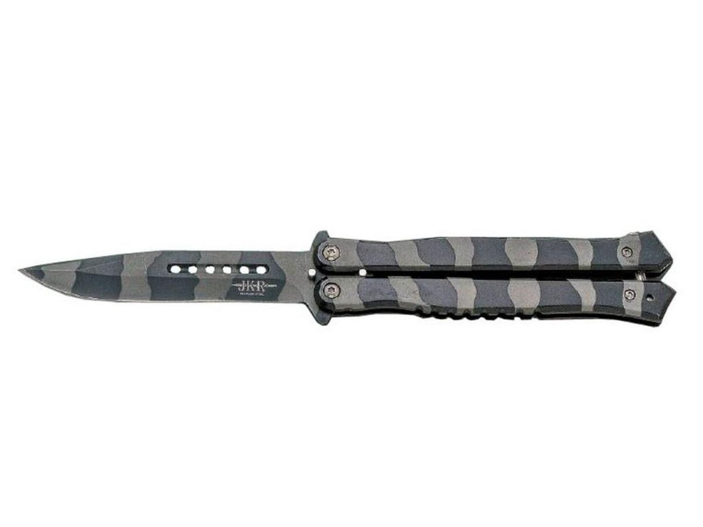 nůž typu motýlek 200g v černošedém camo provedení s nerezovou maskovanou čepelí 104mm s odlehčovacími otvory a maskovanou střenkou z aluminia jištěnou západkou