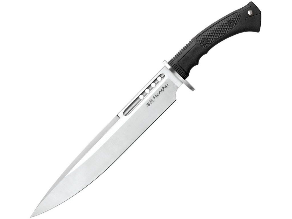 Celková délka 18,75" (47,63 cm). 12" (30,48 cm) saténová čepel. Černá TPR rukojeť. Nerezový chránič. Otvor pro šňůrku. Nerezová plochá kuželová brusná čepel 7Cr13 s průchozími otvory snižujícími hmotnost. Černé kožené pouzdro na opasek.