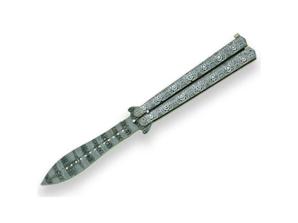Nůž typu motýlek 155g s nerezovou jednostranně broušenou čepelí 105mm s odlehčovacími otvory a vzorovanou střenkou z aluminia jištěnou západkou