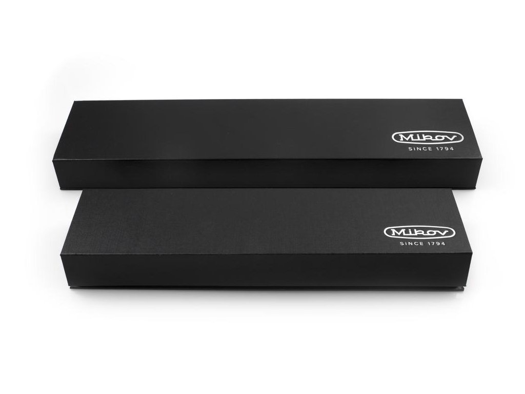 - Kvalitní čepel s logem Mikov je vyrobena z martenzitické korozivzdorné oceli DIN 1.4116 (dovoz SRN) o tvrdosti 55 HRc a zasazena do dřevěného držadla.