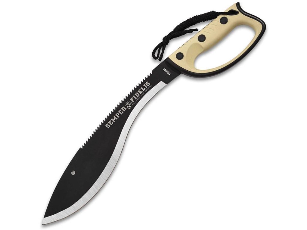 Celková délka 21" (53,34 cm). 14,5" (36,83 cm) černě potažená nerezová čepel na pilu. Pogumovaná syntetická rukojeť Desert Tan. Otvor pro šňůrku. Rukojeť ve stylu šavle. Černé syntetické pouzdro na opasek.