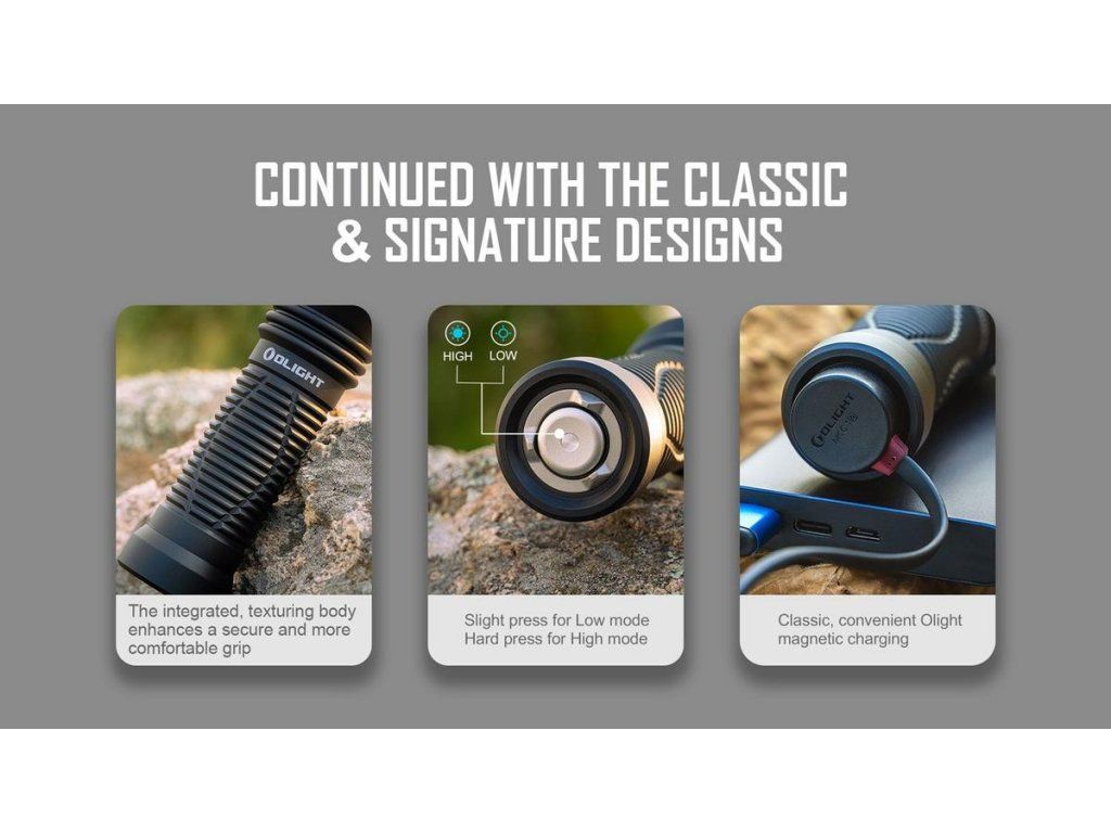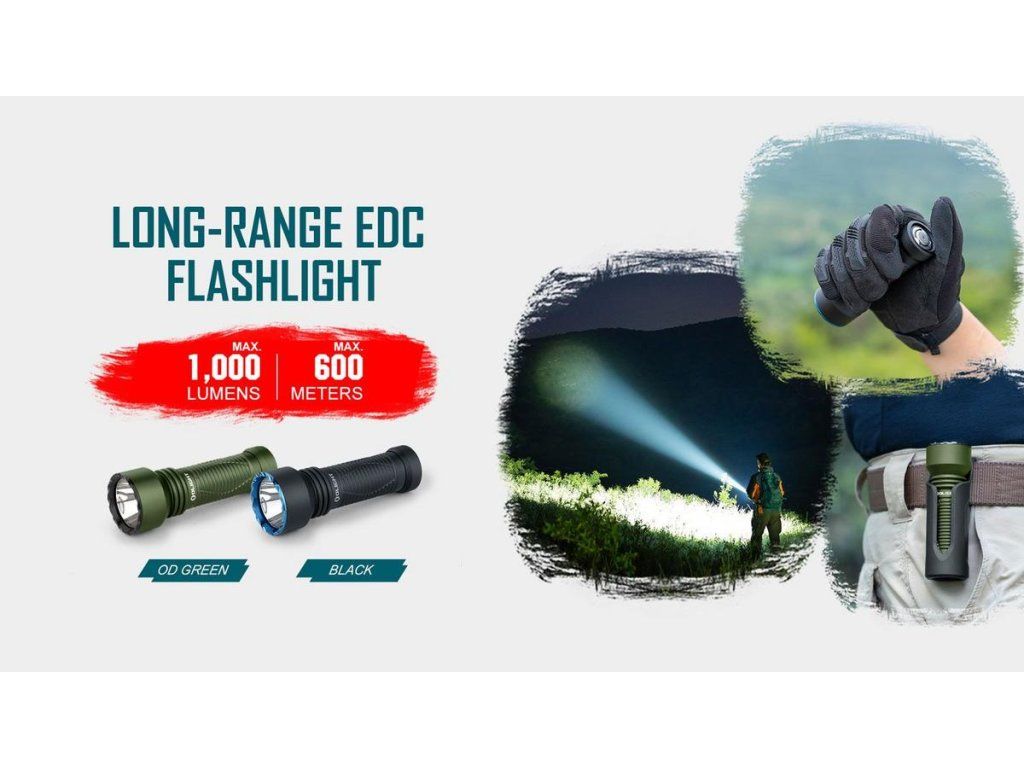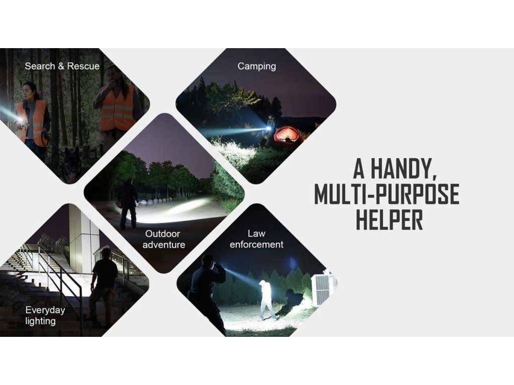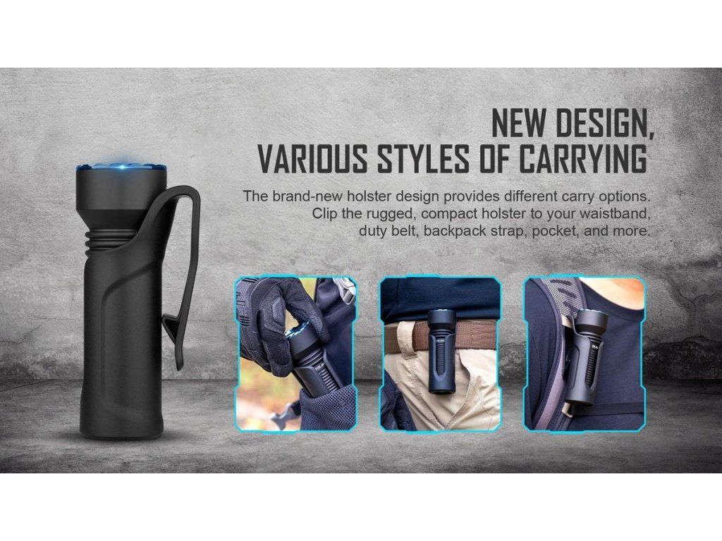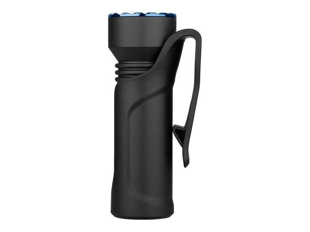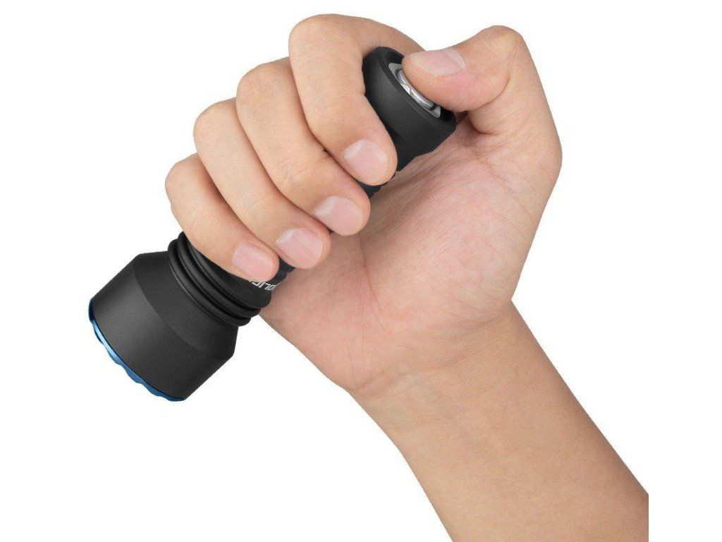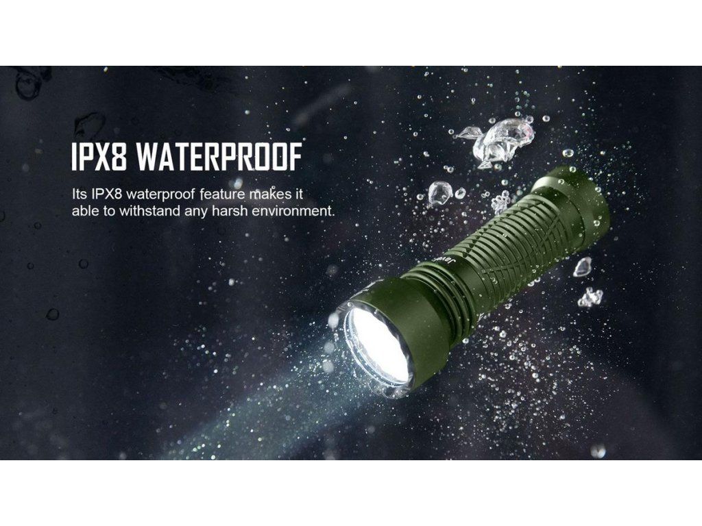 Ovládání svítilny je zajištěno zadním spínačem a její zabudovaný indikátor slabé baterie vás pomocí vibrací upozorní na nutnost dobití. Tělo svítilny je vyrobeno z leteckého hliníku s tvrdou anodizací v černé barvě, což zajišťuje její vysokou odolnost. Tvarovaná rukojeť poskytuje pohodlný a stabilní úchop, což zvyšuje uživatelský komfort při dlouhodobém používání. Svítilna je dodávána s krytem pro snadné přenášení a splňuje standard IPX8, což znamená, že je odolná proti nepřetržitému ponoření do hloubky 1,5 metru.