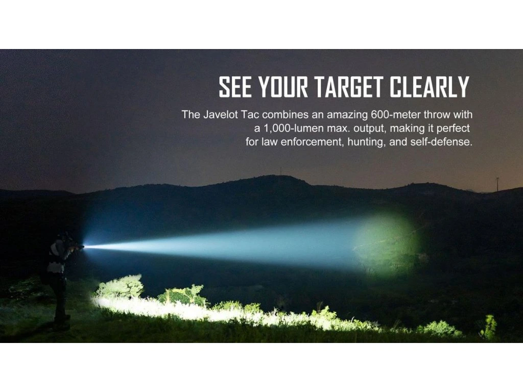 Javelot Tac-P/Tac-M je kompaktní taktická svítilna (WML) s dlouhým dosahem, určená pro použití na zbraních s dlouhým dosahem. Toto výkonné světlo dosahuje dosvitu až 600 metrů a poskytuje světelný tok až 1 000 lumenů díky kruhovému paprsku. Je ideální pro prosazování práva, lov a sebeobranu.