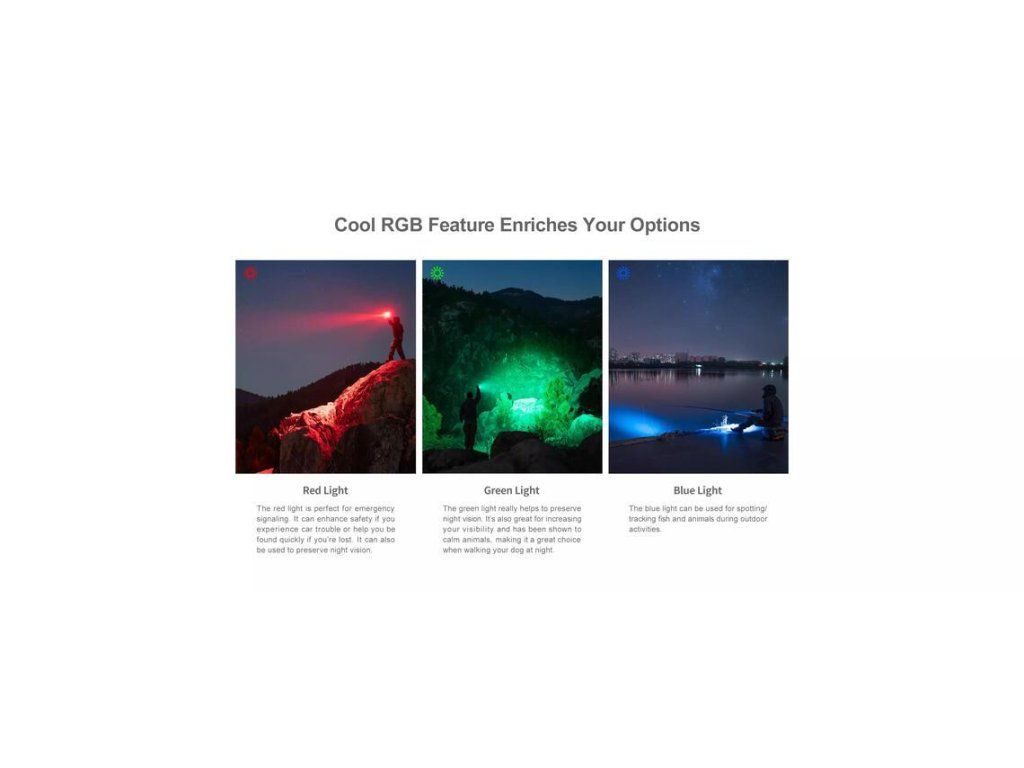 RGB zelené světlo je vhodné pro noční aktivity, protože neruší zvěř v lese, což ocení myslivci a milovníci přírody. Je ideální pro večerní venčení psa.