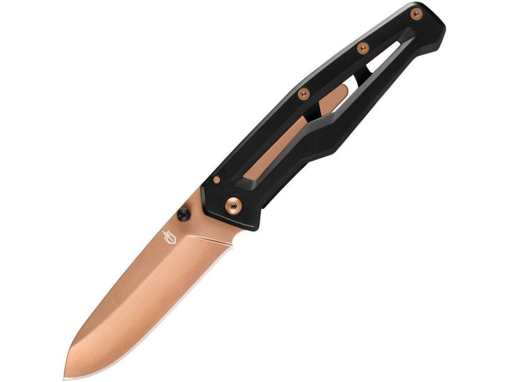 4" (10,16cm) zavřená. 3" (7,62cm) bronzová TiNi potažená nerezová čepel 5Cr13MoV. Černá nerezová rukojeť. Čep na palec. Kapesní klip.