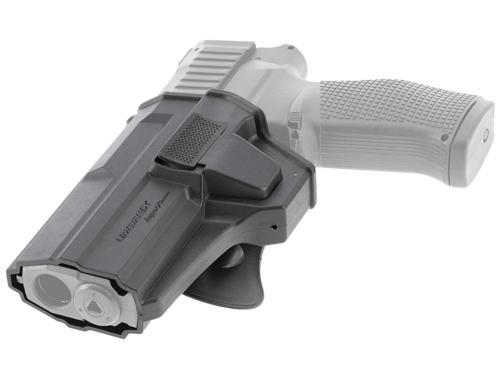 Pouzdro je vyrobeno z odolného polymeru a jeho konstrukce je tvarovaná podle zbraně, což zajišťuje pevné usazení a bezpečné nošení. Integrované zajišťovací tlačítko spolehlivě fixuje pistoli v pouzdře a zároveň umožňuje rychlé a intuitivní tasení jednou rukou.