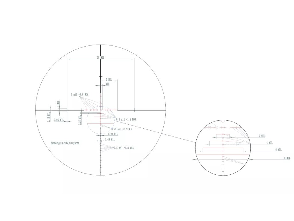 Rektifikační komínky jsou uzavřené, což chrání nastavení před nechtěným pootočením v terénu. Nastavení kříže je jemné, přesné a má hodnotu 1/4 MOA na klik. Leptaný skleněný záměrný kříž je vybaven červeným podsvícením s 11 stupni intenzity, které se ovládá levým komínkem. Napájení zajišťuje baterie CR2032 (součástí balení).