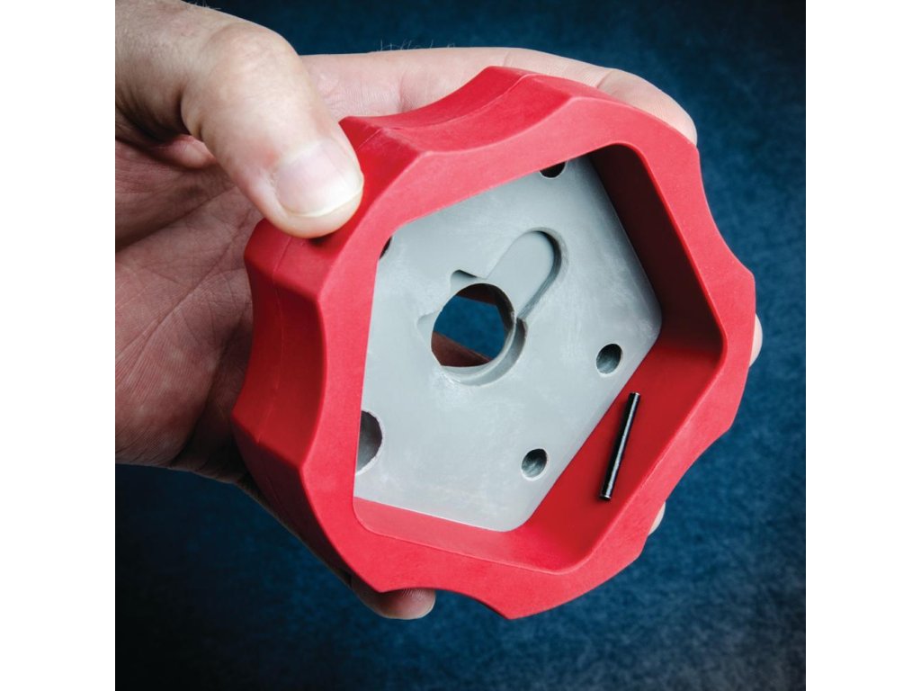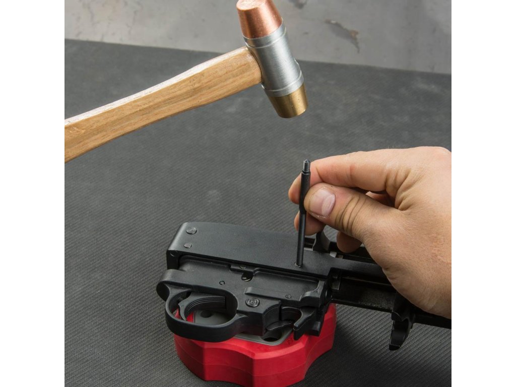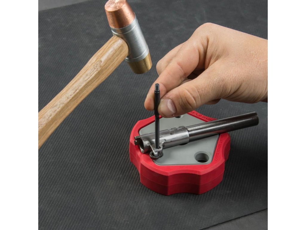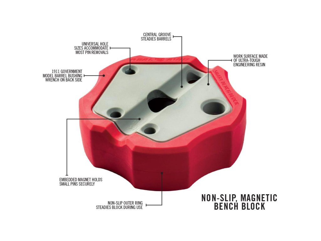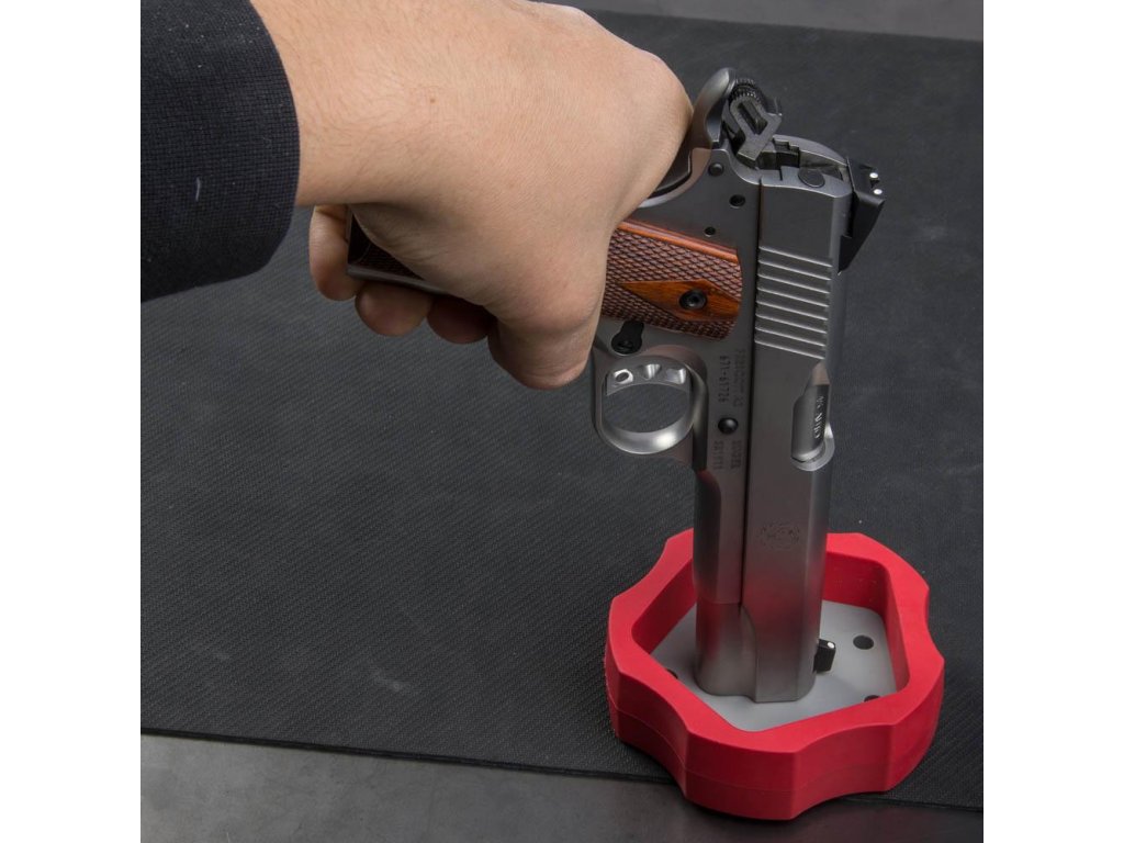 Protiskluzový vnější kroužek zabraňuje klouzání bloku po stole při vytlačování kolíků. Zabudovaný magnet zachycuje a drží vytlačené kolíky, takže se neodkutálí. Zaoblená drážka usazuje hlavně a pistolová pouzdra pro zvýšení stability. Navrženo tak, aby fungovalo s většinou pistolí. Usnadňuje a urychluje práci!