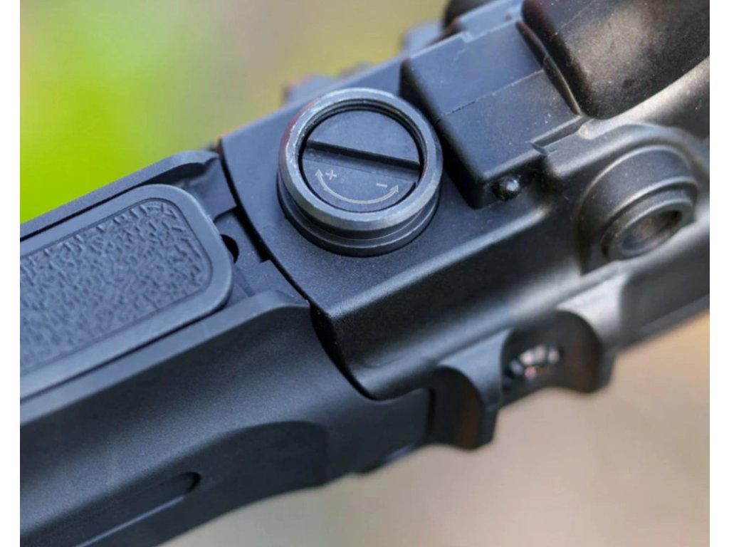 Díky přístupu skrz kryt regulátoru lze výkon rychle přizpůsobit aktuálním podmínkám použití – ať už jde o tréninkovou střelbu, nácvik manipulace, přesnější cílení nebo úpravu energie podle prostředí. Nastavení probíhá jednoduše pootočením šroubu, přičemž změna výkonu je plynulá a okamžitě znatelná.