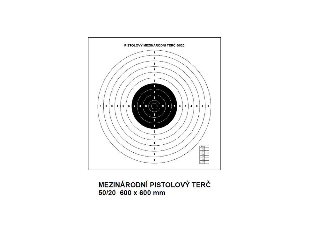 Jedná se o klasický kruhový terč, který je možné použít téměř pro každou střeleckou disciplínu. Hodnocení zásahů od 1 do 10. Vytištěna je i tabulka pro snadnější výpočet skóre.