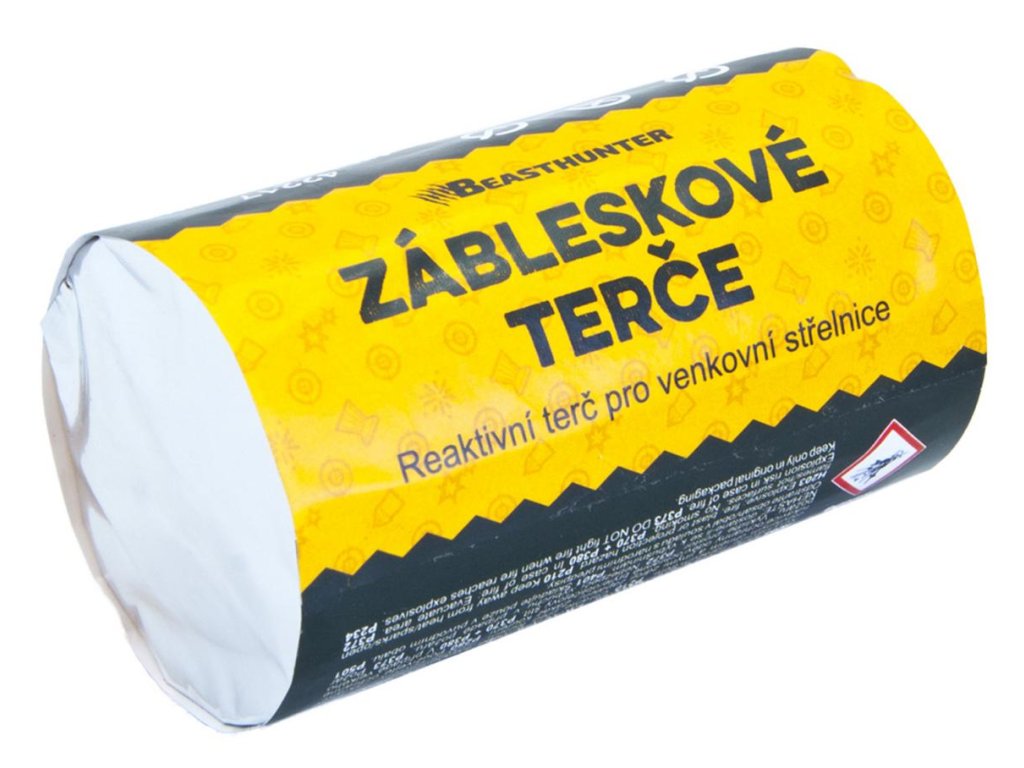 Dodržujte bezpečnou vzdálenost od terče. Zábleskový efekt doprovází hoření a dým. Terč je opatřen oboustrannou páskou.