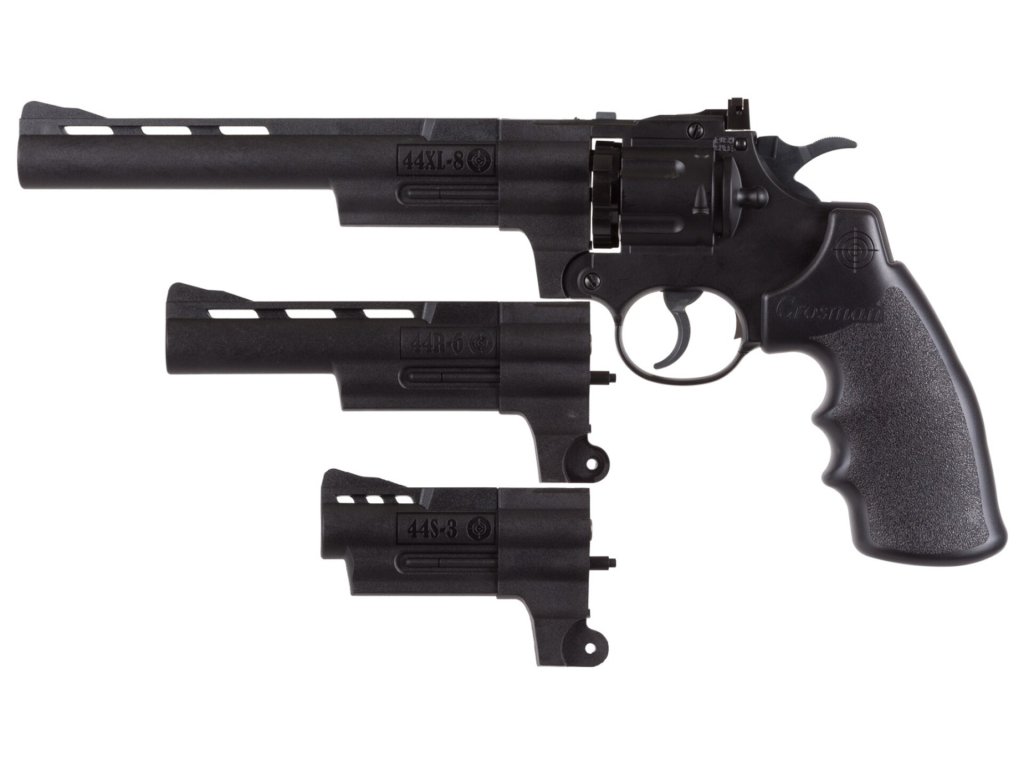 Crosman Triple Threat je unikátní CO2 vzduchový revolver, který nabízí neobvykle široké možnosti přizpůsobení. Díky třem výměnným ocelovým drážkovaným hlavním o délkách 3", 6" a 8" si můžete revolver snadno upravit podle typu střelby – od kompaktní verze pro krátké vzdálenosti po dlouhou hlaveň pro maximální přesnost.