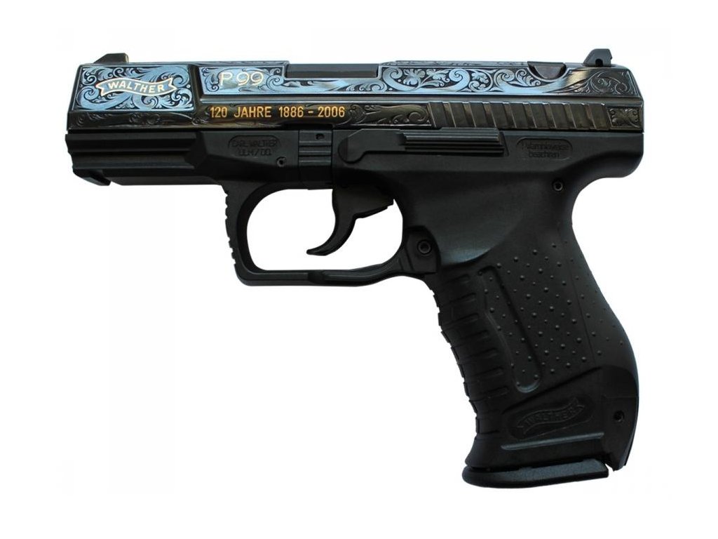 Jubilejní model samonabíjecí pistole Walther P99QA s rytinou na závěru zbraně. Polymerový rám, ocelový gravírovaný závěr, rarita pro sběratele.